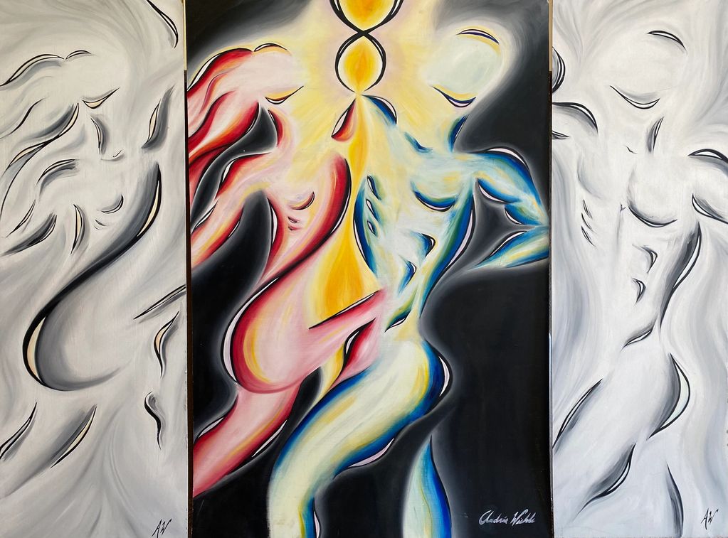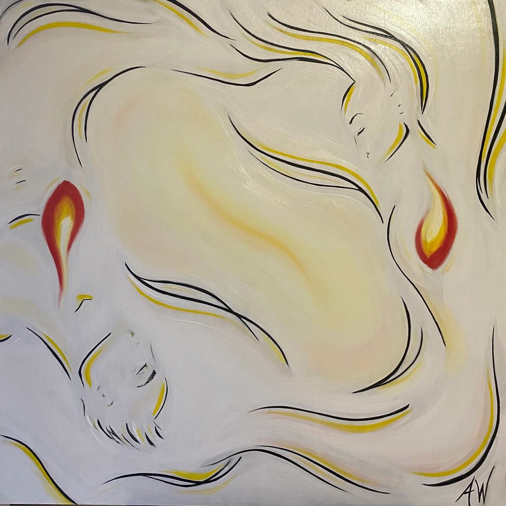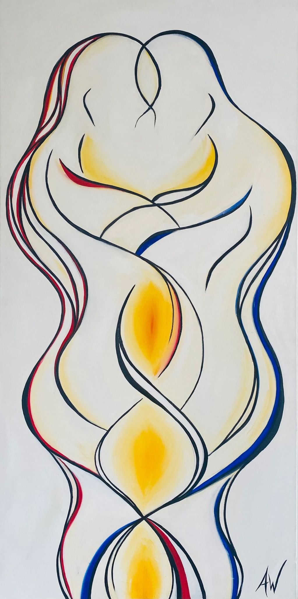 This painting depicts how we are most powerful when male and female unit while maintaining and honoring our unique differences. The red represents the feminine and blue represents the masculine. There is love, respect, desire, and reverence for each others differences, and in that dynamic we are powerful. With