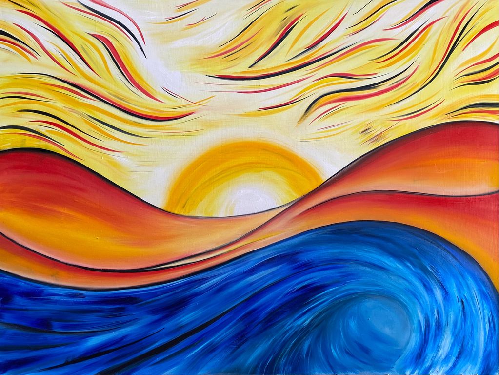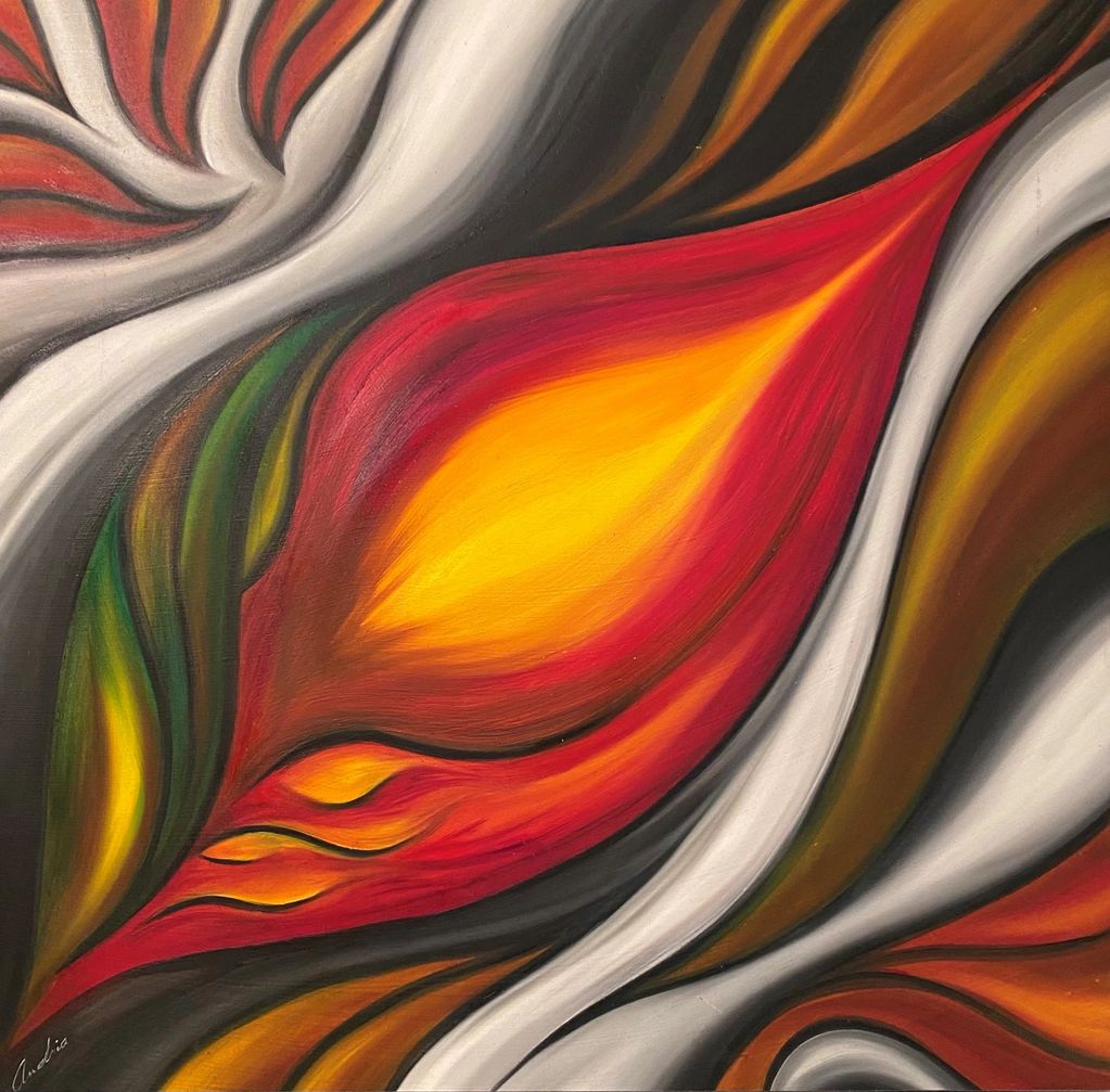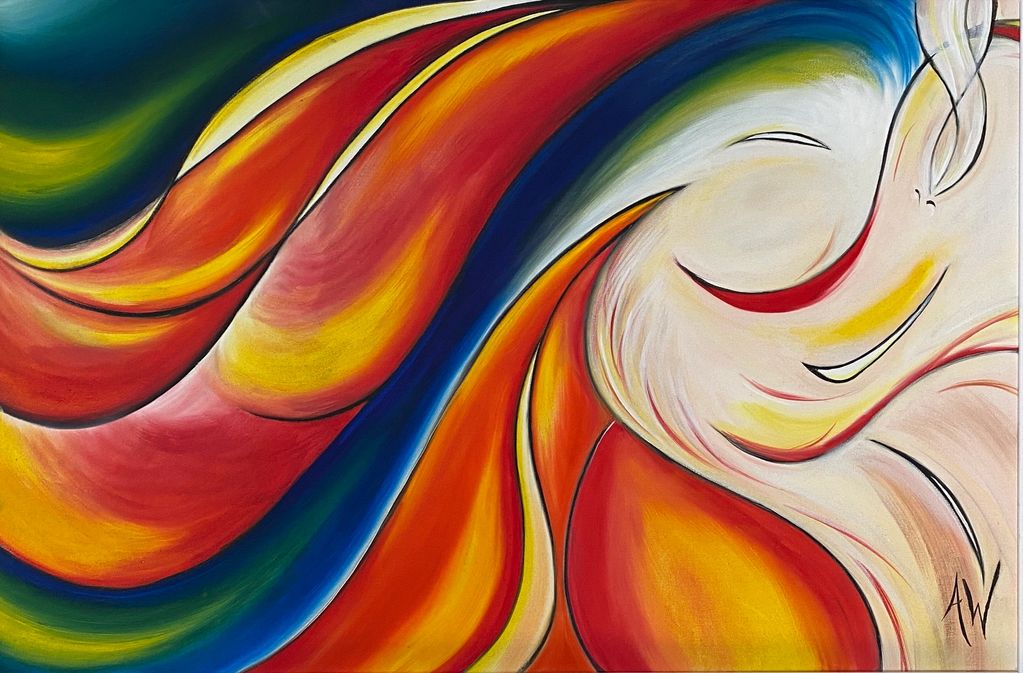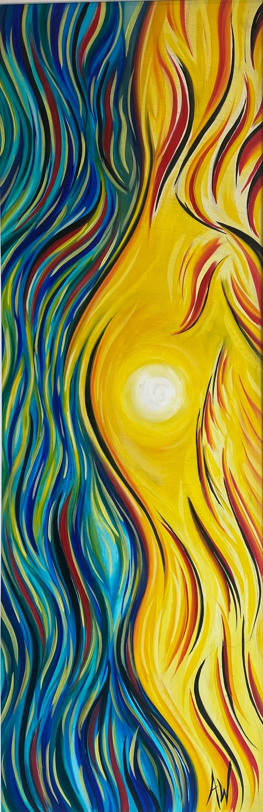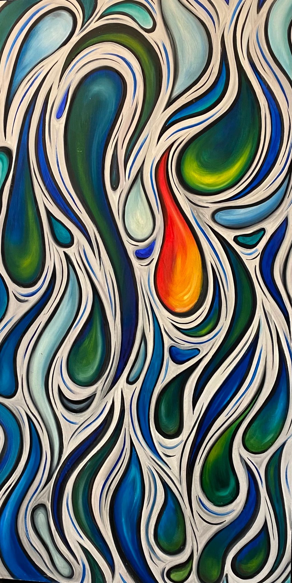 This painting depicts the overflow of tears, that can be a powerful expression for healing. The red orange colors represent the warmth that comes to bring resolve and healing in love, from the release of those tears. This can be a true grace in our time of pain and grief.