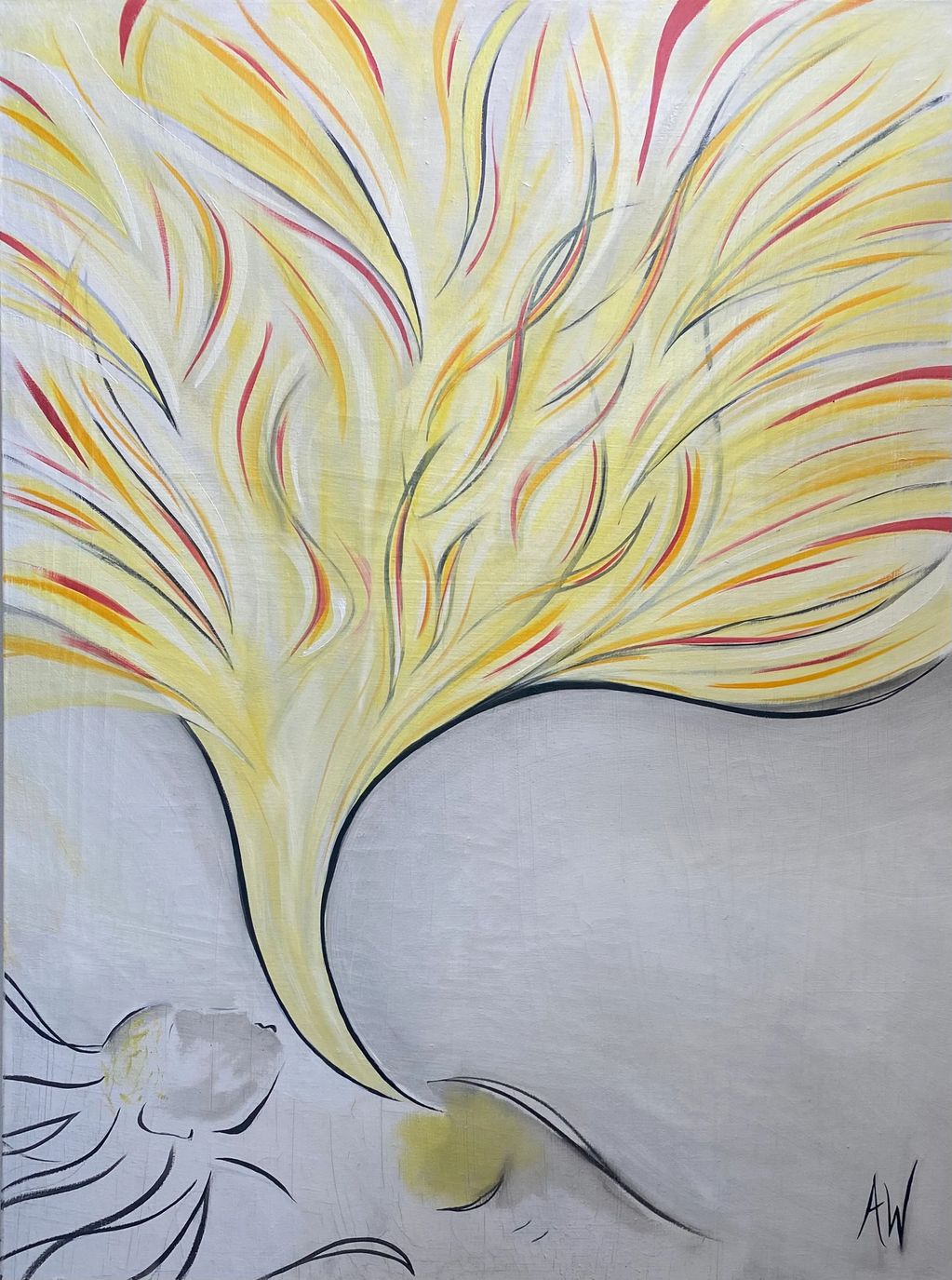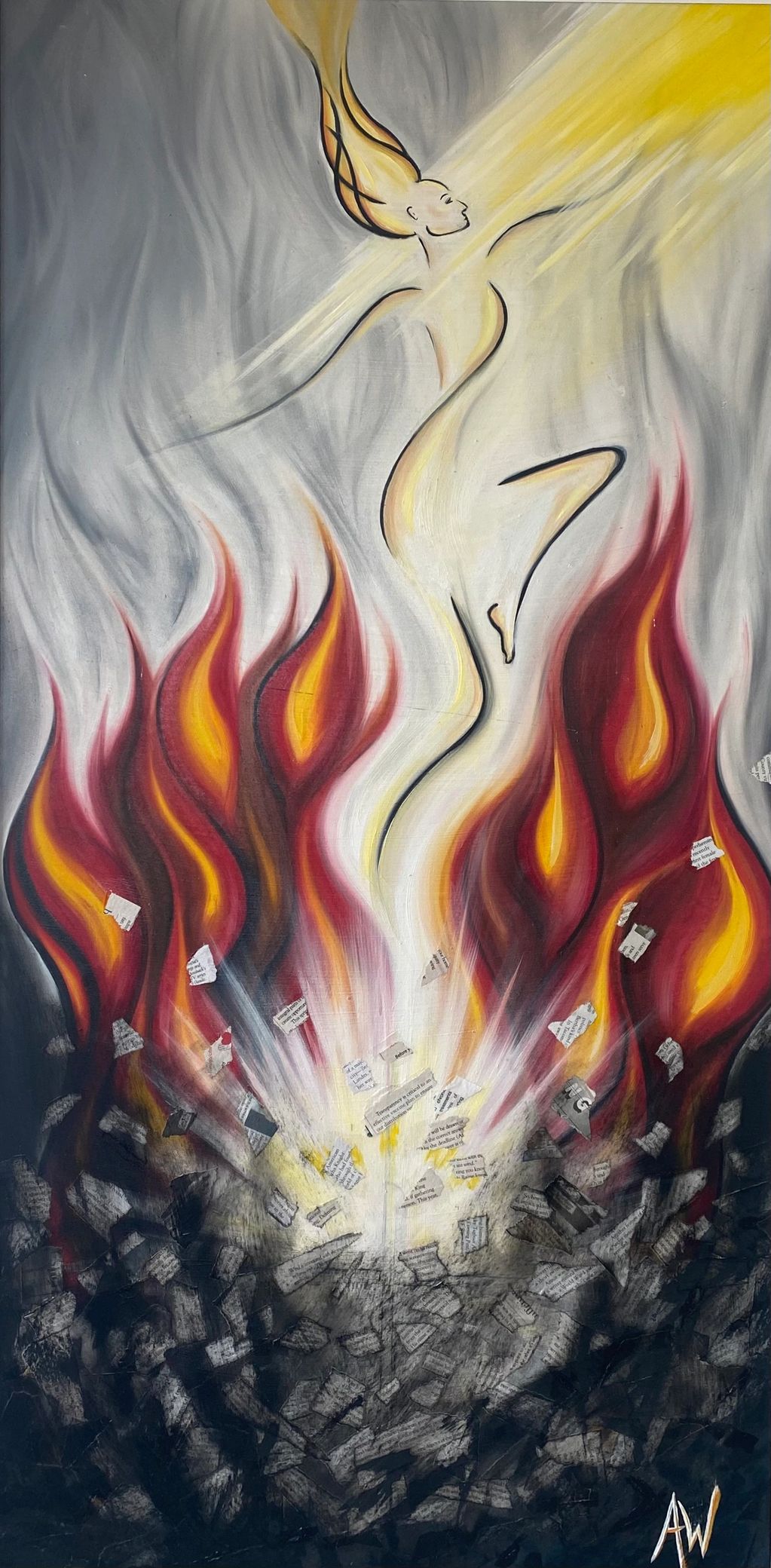 This painting is a version of the rising Pheonix. When our eyes are fixed on the light, we are only then lifted out of the fire and ashes of this world. We are lifted out of the mirey clay and what was once ash is turned to beauty.
