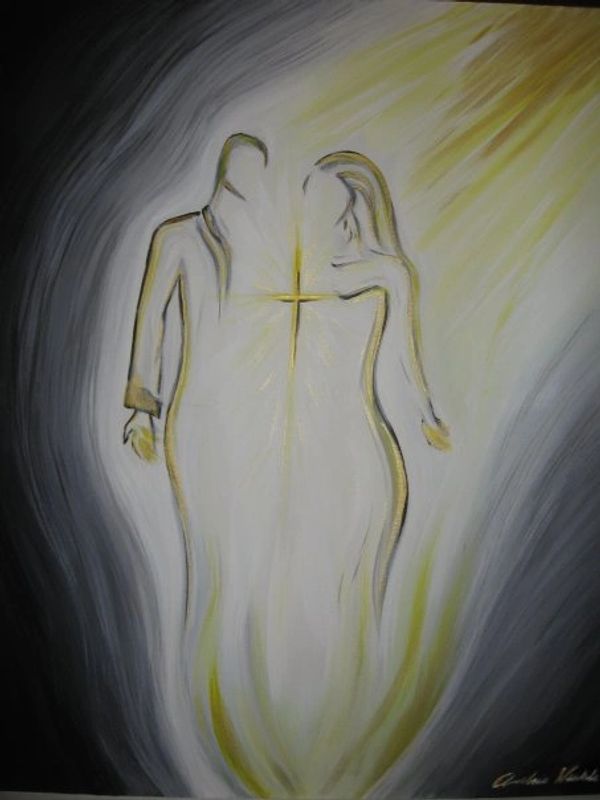 A vision of love and beauty. At times my work flows freely without much regard for detail, to simply capture the essence of what I'm feeling. Often the finished work hold unexpected content, like the vision of life created in the center of them through intimacy. A friend who is a scientist, also commented that this painting looks simila